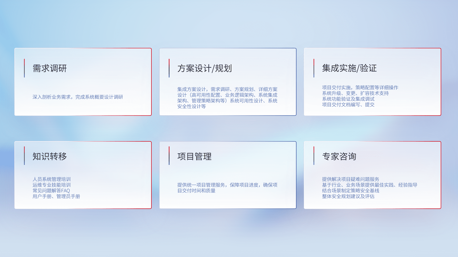 针对客户行业特性,,,,将宏观的安全战略和需求,,,通过专业的交付服务,,实现项目落地,,为客户提供标准规范的集成交付服务。。。